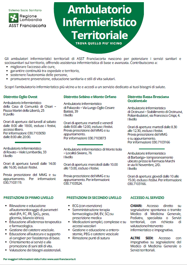 - ambulatori infermieristici ubicati sul territorio: nati per potenziare i servizi sanitari e sociosanitari sul territorio, offrendo assistenza infermieristica di base e avanzata a persone con bisogni assistenziali che necessitano di essere guidate nella rete dei servizi socio-sanitari, medici di medicina generale, pediatri, medici di continuità assistenziale e specialisti, per un confronto professionale mirato alla migliore presa in carico, utenti e famiglie in carico ai servizi C-DOM/UCP-Dom dell’ASST Franciacorta, che possono ricevere supporto telefonico o l’attivazione della pronta disponibilità infermieristica.