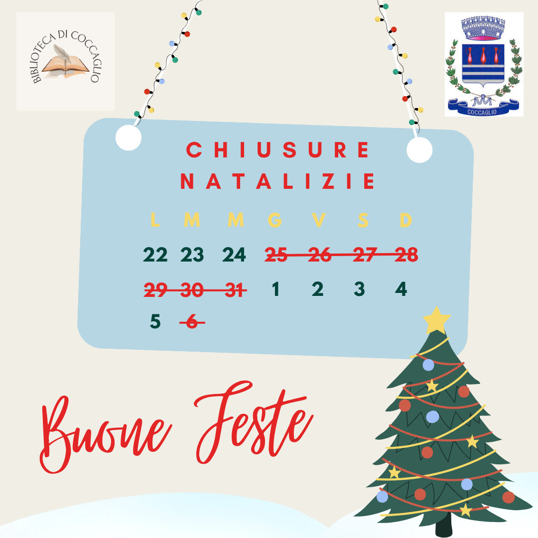 Descrizione La Biblioteca comunale resterà chiusa nelle giornate di - da giovedì 25 dicembre a mercoledì 31 dicembre - martedì 6 gennaio