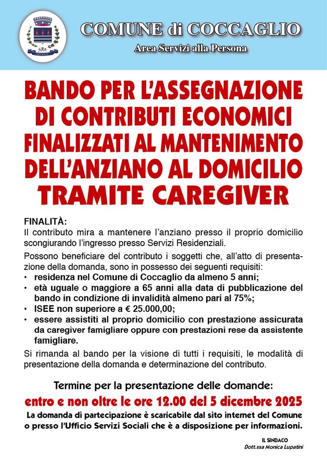 Si comunica che e' aperto il bando per l’assegnazione di contributi economici finalizzati al mantenimento dell’anziano al domicilio tramite caregiver. La domanda (allegato B) può essere inviata alla pec del Comune di Coccaglio: protocollo@pec.comune.coccaglio.bs.it oppure può essere consegnata all'Ufficio Servizi Sociali negli orari di apertura al pubblico. Si rimanda al bando (allegato A) per la visione di tutti i requisiti previsti.
