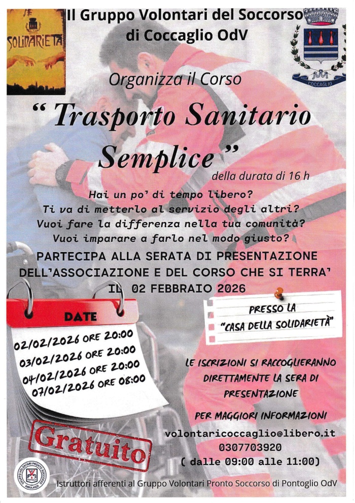 Il Gruppo Volontari del Soccorso di Coccaglio OdV organizza il Corso di Trasporto Sanitario Semplice, della durata complessiva di 16 ore, rivolto a persone interessate a svolgere attività di volontariato in ambito sanitario.