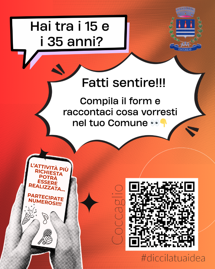 Il Comune di Coccaglio invita i giovani tra i 15 e i 35 anni a partecipare a un breve sondaggio per raccogliere idee, proposte e suggerimenti utili alla programmazione di iniziative e attività rivolte al mondo giovanile.