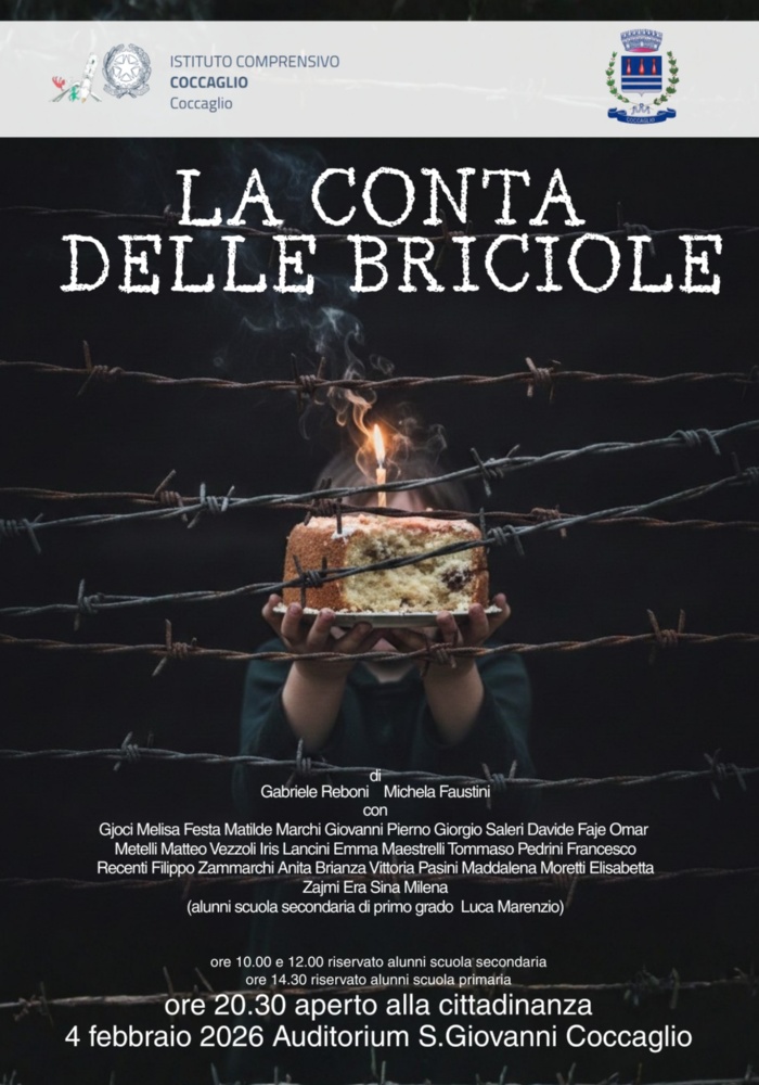 Mercoledì 4 febbraio 2026 alle ore 20:30 presso l'Auditorium San Giovanni Battista è aperto alla cittadinanza lo spettacolo dell'Istituto Comprensivo di Coccaglio "La conta delle briciole"